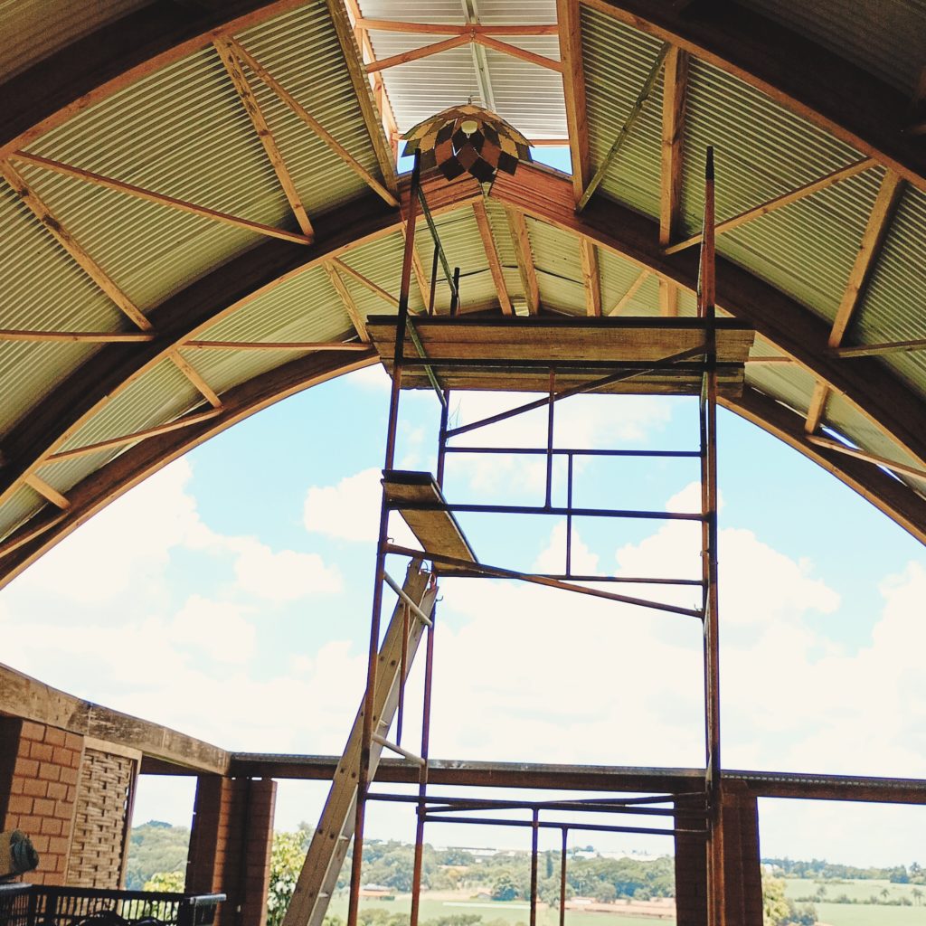 Aluguei andaimes para colocarmos as luminárias no alto e resolver alguns probleminhas no telhado.
