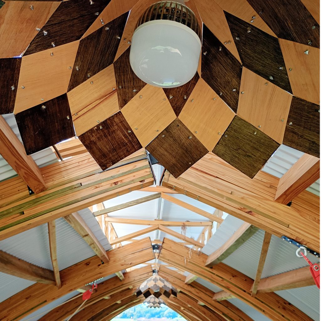 A luminária tem formato de zomedro (Zome), feita de compensado naval de 4mm, as uniões com fita perfurada e rebites. Metade das peças recebeu verniz transparente, metade verniz com corante. Ficou com um visual um pouco mais “industrial” do que eu esperava, em grande parte pelos rebites, mas ainda acho quej ficaram lindonas.