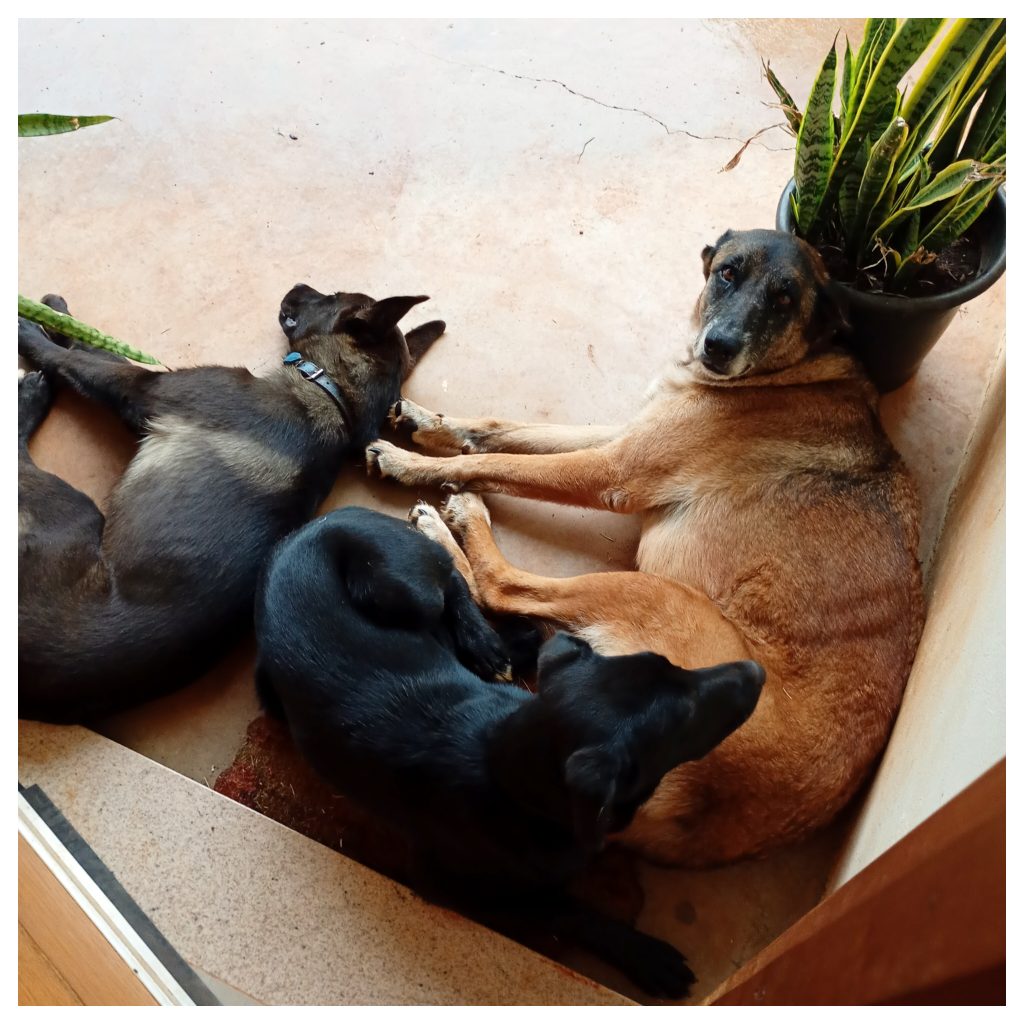 A porta abre de repente, e lá estão os três cachorros, empilhados na soleira para fugir da chuvinha do dia todo.