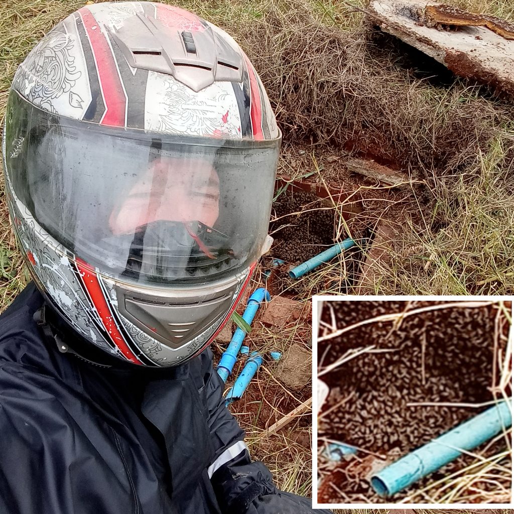 Não é a caixa d’água, tudo certo com os registros, ah, a roçadeira estourou o cano aqui. Pensei que estava mais fundo. Coisa fácil de arrumar, não fossem as abelhas.