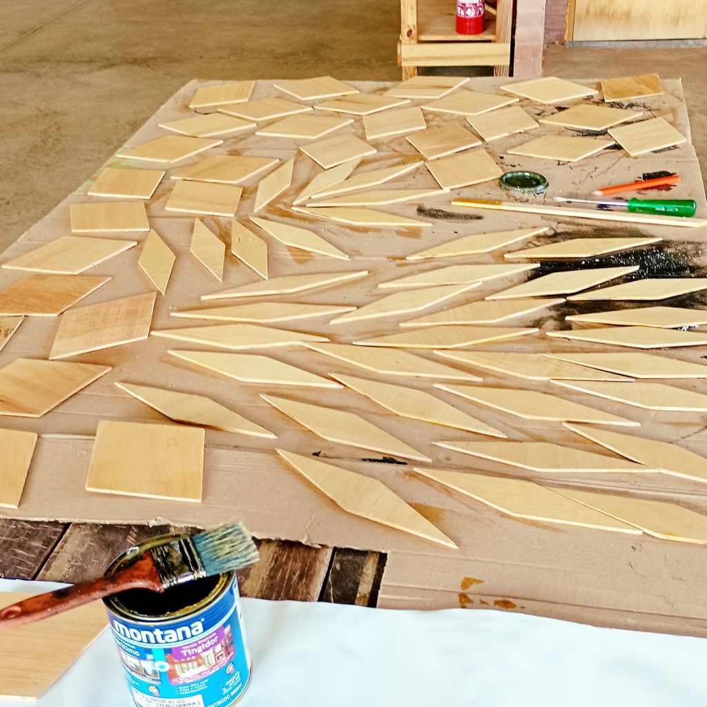 Fazer mais de uma luminária ao mesmo tempo é realmente mais rápido do que fazer uma de cada vez (no caso, são 3 luminárias, o protótipo está pronto). Por outro lado, são tantas pecinhas para lixar e envernizar! Na foto, metade das peças. Para a outra metade vai corante preto no verniz.