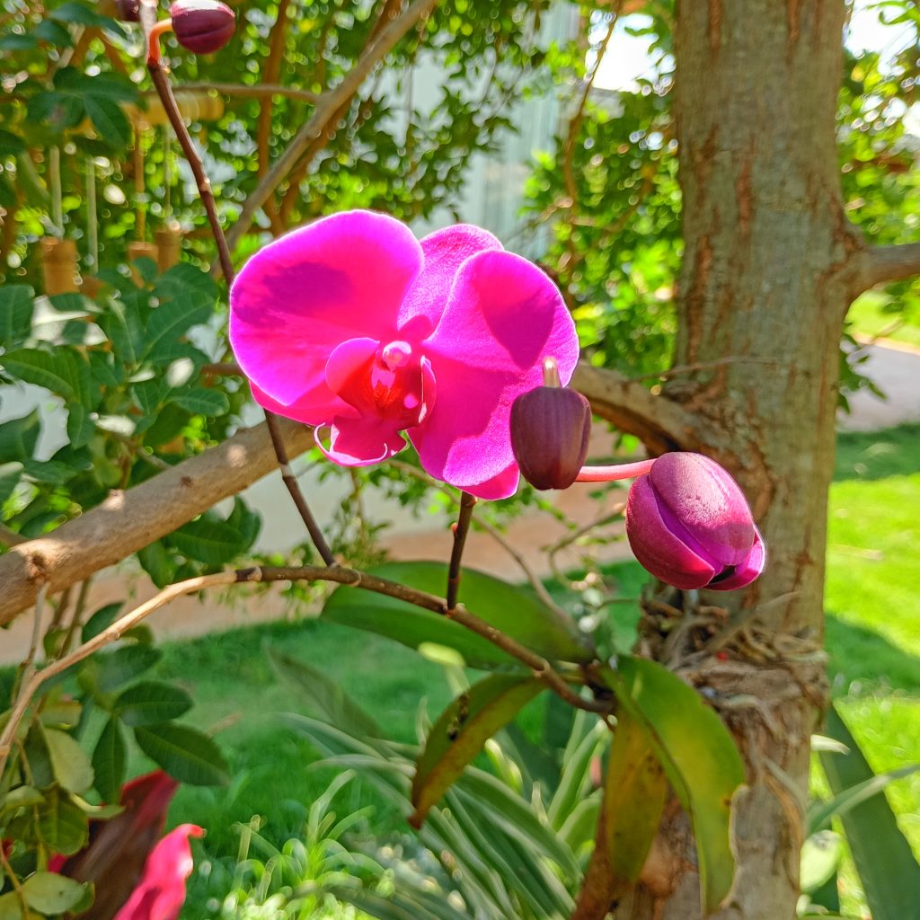Três anos atrás comprei uma orquídea para a esposa, que seguiu o caminho natural das plantas de casa. Enfeitou por duas ou três semanas, perdeu as flores, acabou. Com dó de jogar fora, amarrei numa árvore ali fora e esqueci dela. Até achei que tinha morrido.